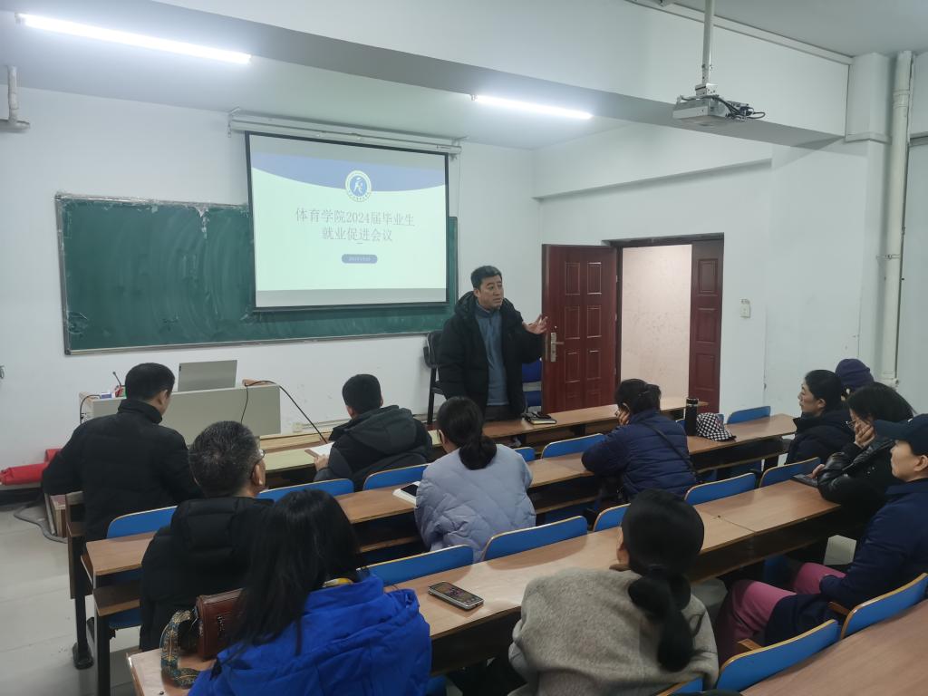 党委副书记贾鹏主持。贾书记对2024届毕业生就业促进工作做了具体部署,他表示一是要以学生为中心,聚焦重点,突破难点,细化落实,做到底数清,情况明,用心用情办好就业实事;二是希望大家通力协作,给学生提供尽可能多的就业资源与就业指导,将就业的重要性传递给学生。