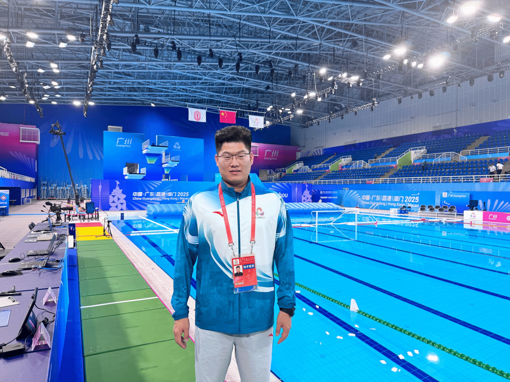 王磊磊,博士,讲师,水球国际级裁判,中国男子水球队副领队。第十五届全国运动会在广东省奥体中心游泳跳水馆担任男子、女子水球比赛技术官员。
